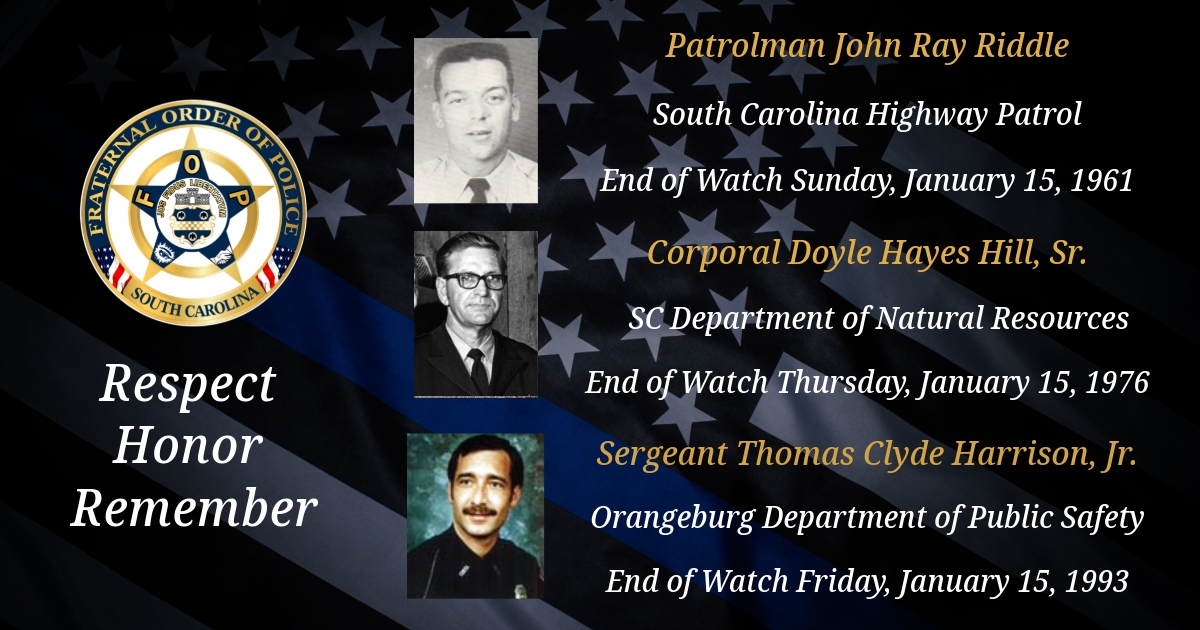 Today, we remember South Carolina Highway Patrol Patrolman John Ray Riddle, South Carolina Department of Natural Resources Corporal Doyle Hayes Hill, Sr., and Orangeburg Department of Public Safety Sergeant Thomas Clyde Harrison, Jr.