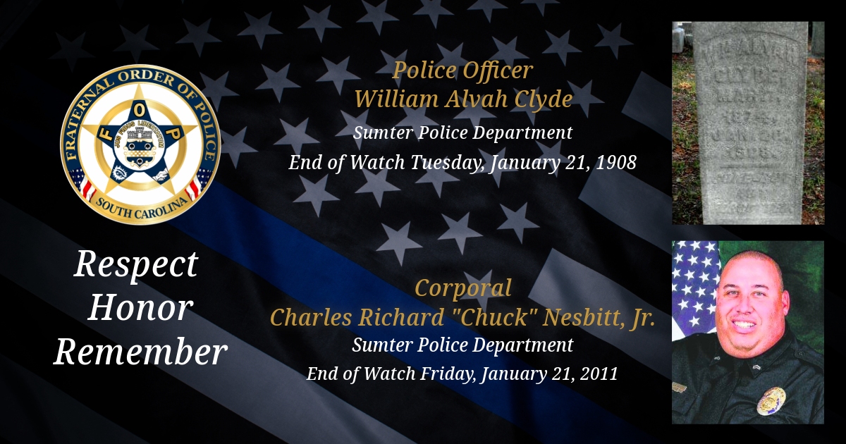 Today, we remember Sumter Police Department Police Officer William Alvah Clyde and Sumter Police Department Corporal Charles Richard “Chuck” Nesbitt, Jr.