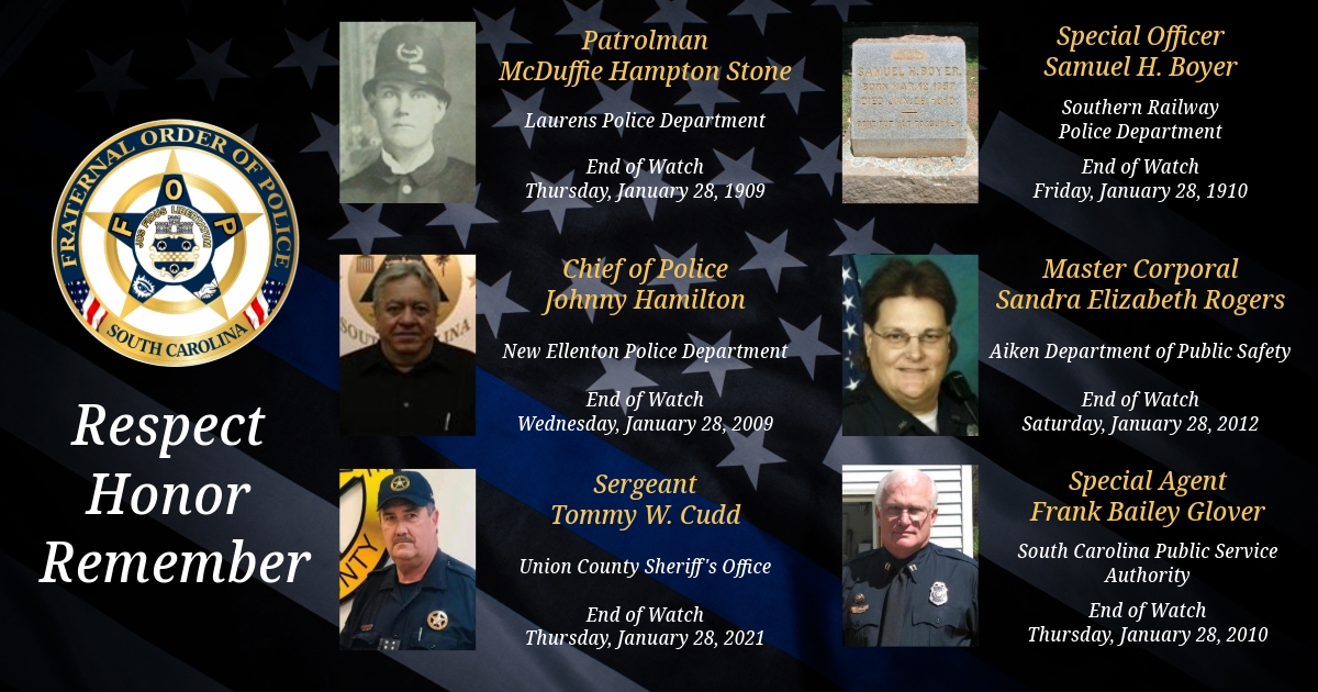 Today, we remember Laurens Police Department Patrolman McDuffie Hampton Stone, Southern Railway Police Department Special Officer Samuel H. Boyer, New Ellenton Police Department Chief of Police Johnny Hamilton, South Carolina Public Service Authority Special Agent Frank Bailey Glover, Aiken Department of Public Safety Master Corporal Sandra Elizabeth “Sandy” Rogers, and Union County Sheriff’s Office Sergeant Tommy W. Cudd.