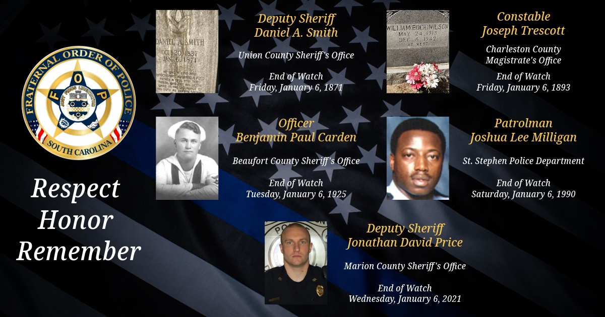 Today, we remember Union County Sheriff’s Office Deputy Sheriff Daniel A. Smith, Charleston County Magistrate’s Constable Joseph Trescott, Beaufort County Sheriff’s Office Officer Benjamin Paul Carden, St. Stephen Police Department Patrolman Joshua Lee Milligan, and Marion County Sheriff’s Office-South Carolina Deputy Sheriff Jonathan David Price.