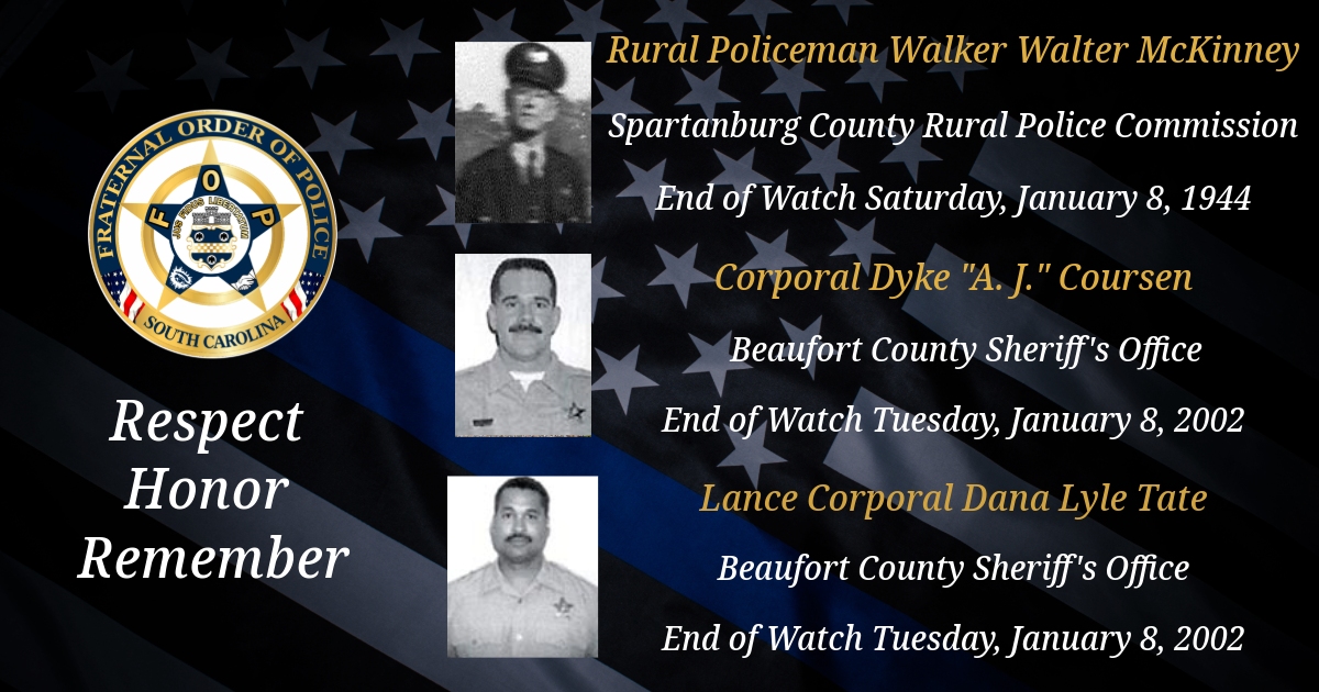 Today, we remember Spartanburg County Rural Police Commission Officer Walker Walter McKinney, Beaufort County Sheriff’s Office Corporal Dyke “A. J.” Coursen, and Beaufort County Sheriff’s Office Lance Corporal Dana Tate.