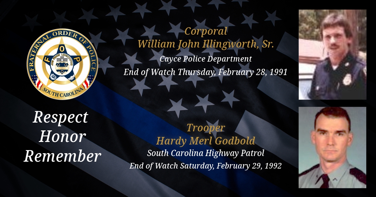 Today, we remember City of Cayce Police Department Corporal William John Illingworth, Sr., and South Carolina Highway Patrol Trooper Hardy Merl Godbold.