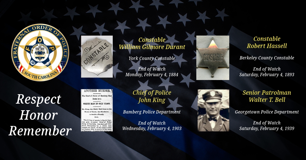 Today, we remember York County Constable William Gilmore DuRant, Berkeley County Constable Robert Hassell, Bamberg Police Department Chief of Police John King, and South Carolina Highway Patrol Senior Patrolman Walter T. Bell.