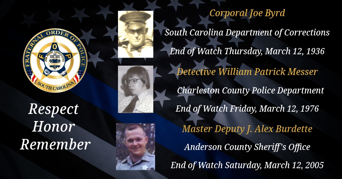 Today, we remember Anderson County Sheriff’s Office SC Master Deputy J. Alex Burdette, South Carolina Department of Corrections Corporal Joe Byrd, and Charleston County Police Detective William Patrick Messer.