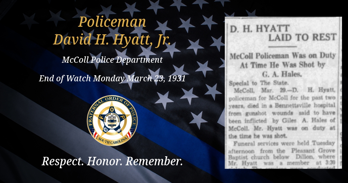 Today, we remember McColl Police Department Policeman David H. Hyatt.