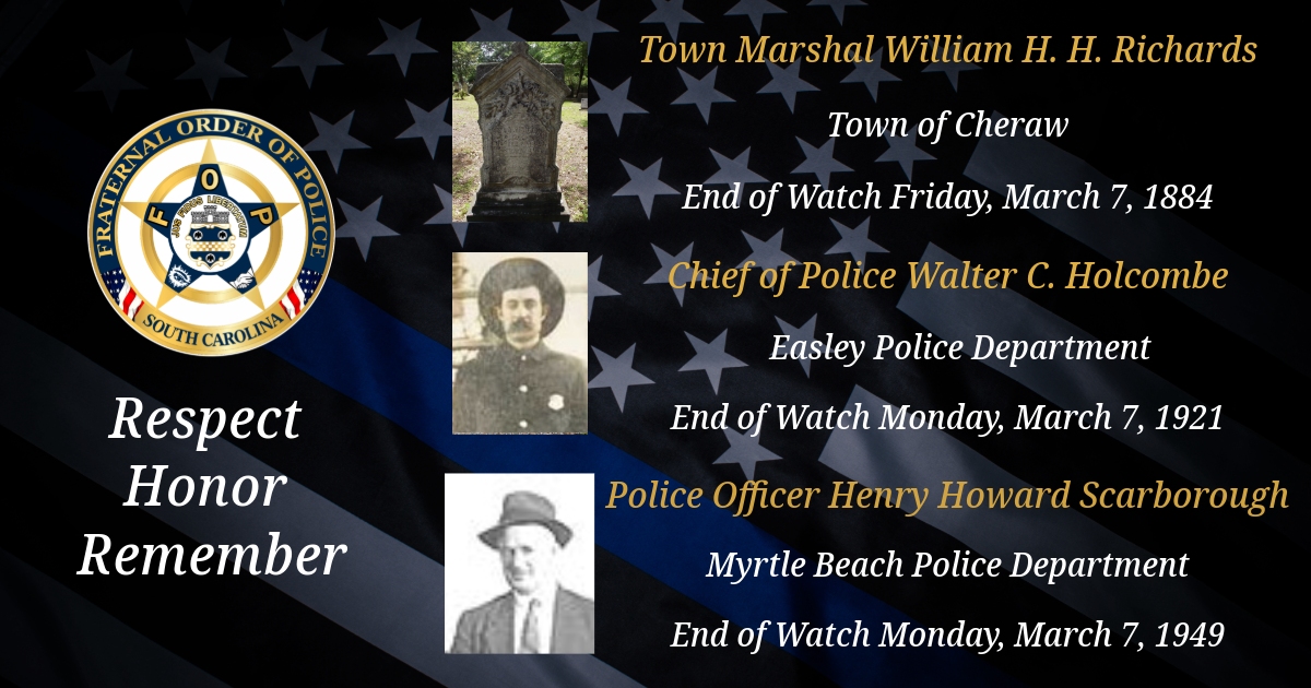 Today, we remember Cheraw South Carolina Town Marshal William H. H. Richards, Easley Police Department Chief of Police Walter C. Holcombe, and Myrtle Beach Police Department Police Officer Henry Howard Scarborough.