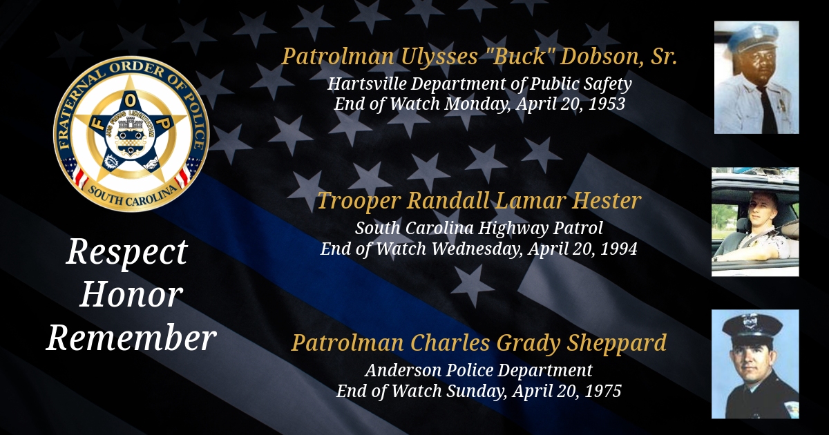 Today, we remember Hartsville Police Department SC Patrolman Ulysses “Buck” Dobson, Sr., South Carolina Highway Patrol Trooper Randall Lamar Hester, and City of Anderson Police Department Patrolman Charles Grady Sheppard.