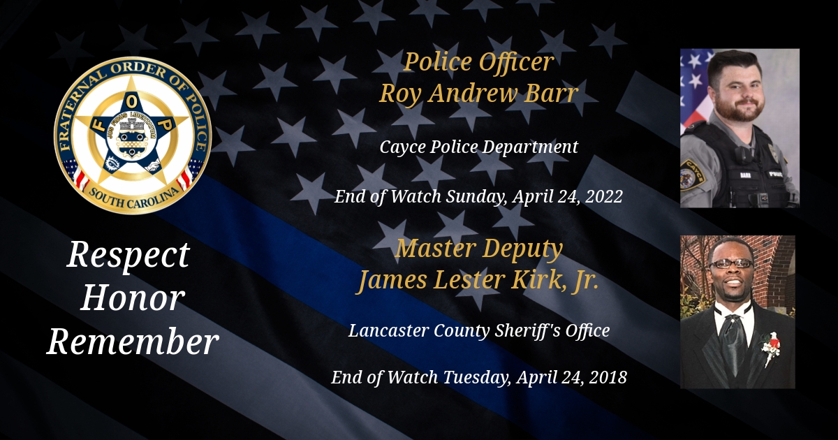 Today, we remember City of Cayce Police Department Police Officer Roy Andrew Barr and Lancaster County Sheriff’s Office SC Master Deputy James Lester Kirk, Jr.
