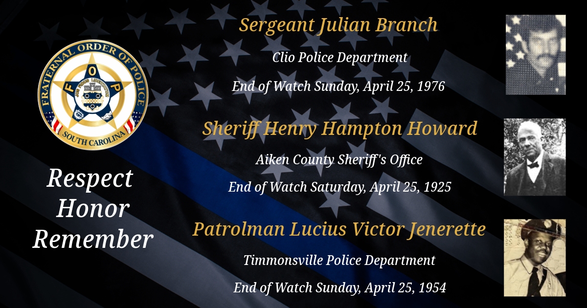 Today, we remember Clio Police Department Sergeant Julian Branch, Aiken County Sheriff’s Office Sheriff Henry Hampton Howard, and Timmonsville Police Department Patrolman Lucius Victor Jenerette.