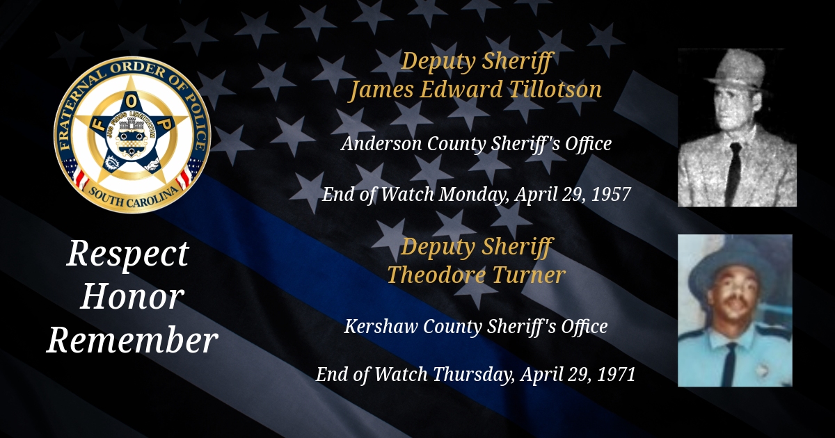 Today, we remember Anderson County Sheriff’s Office SC Deputy Sheriff James Edward Tillotson and Kershaw County Sheriff’s Office Deputy Sheriff Theodore Turner.