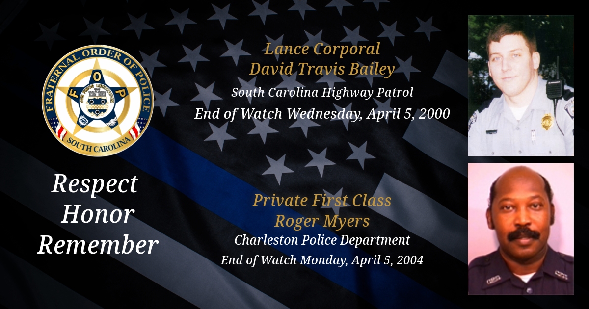 Today, we remember South Carolina Highway Patrol Lance Corporal David Travis Bailey and City of Charleston Police Department Private First Class Roger Myers.