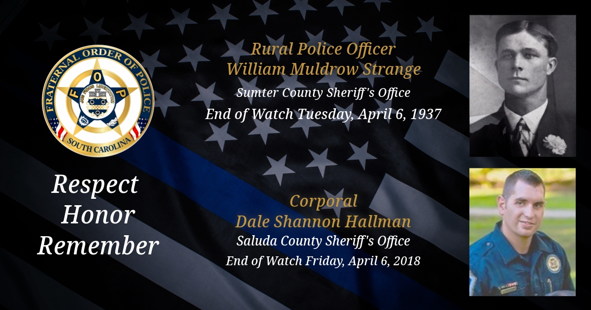 Today, we remember Sumter County Rural Police Officer William Muldrow Strange and Saluda County Sheriff’s Office Corporal Dale Shannon Hallman.