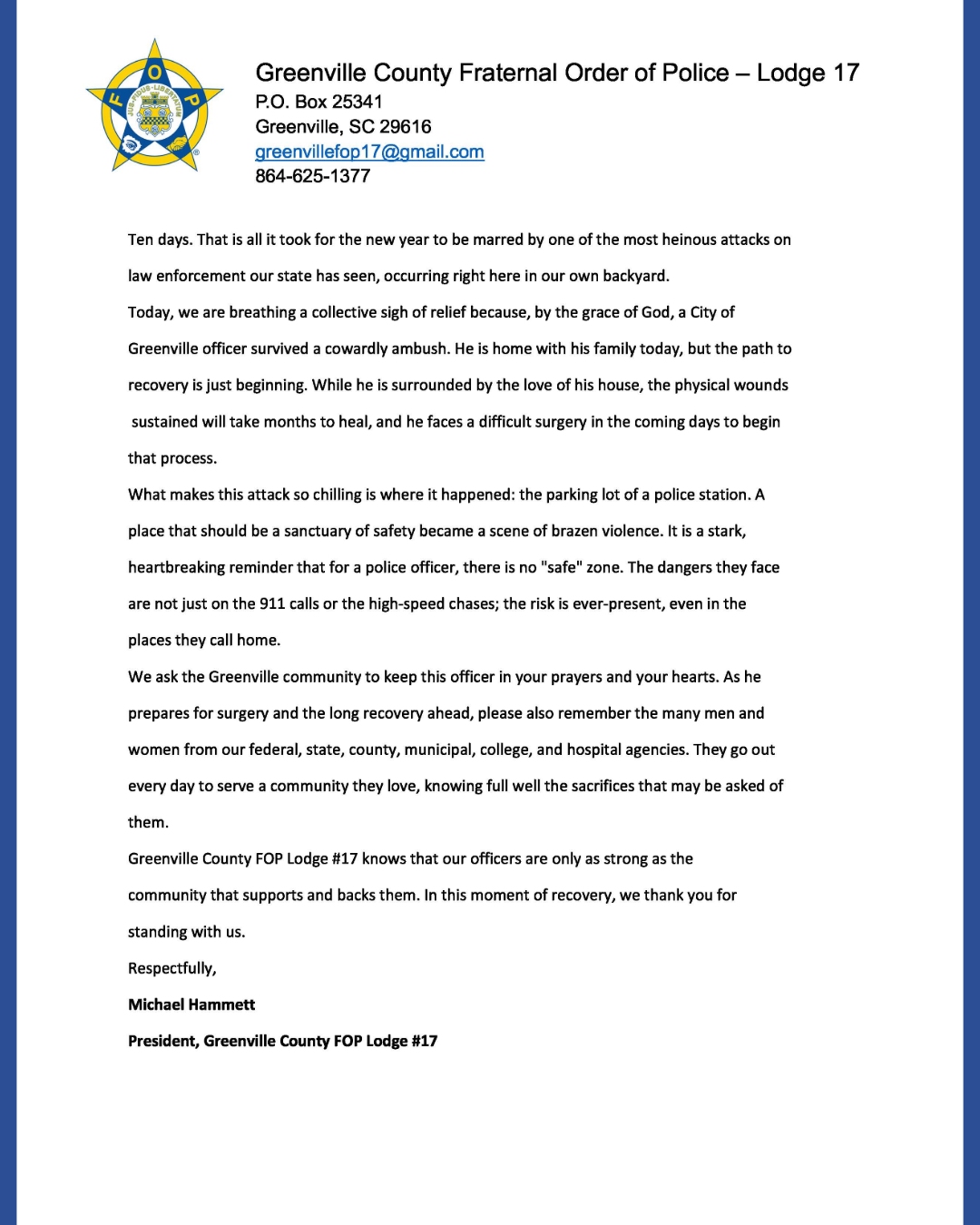 President, Greenville County FOP Lodge #17 Lodge 17 Statement