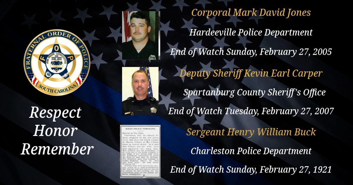 Today, we remember City of Charleston Police Department Sergeant Henry William Buck, Spartanburg County Sheriff’s Office Deputy Sheriff Kevin Earl Carper, and Hardeeville Police Department Corporal Mark David Jones.